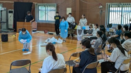 看護師によるスライドを使った講義とデモンストレーションの後、グループに分かれ吐物処理を実践しました。