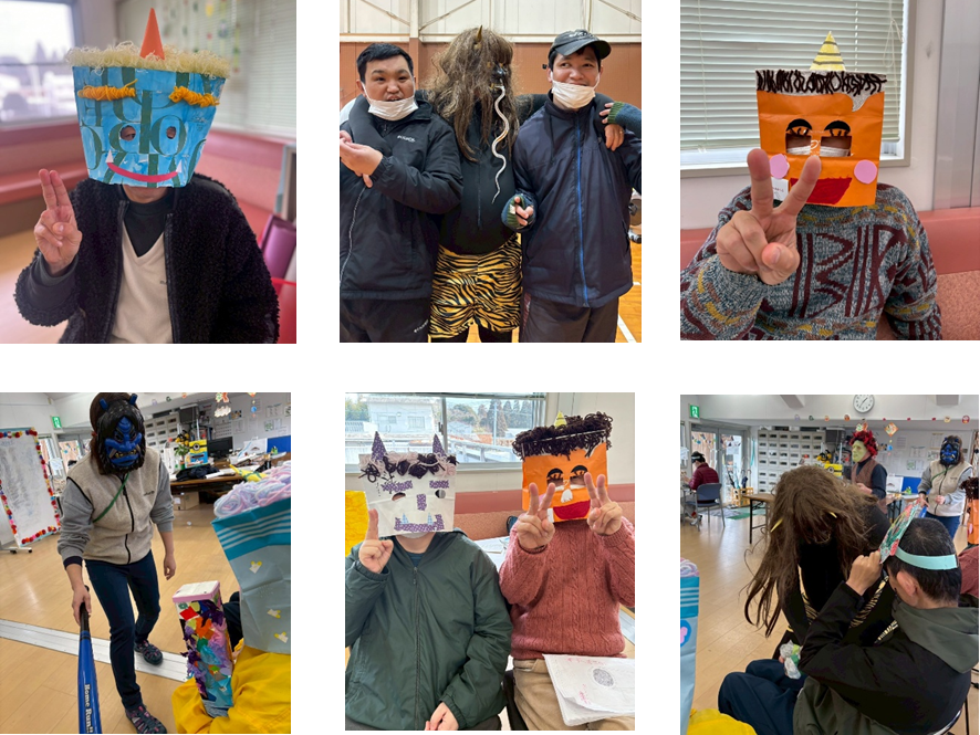 利用者さんが作成した被り物をし、丸めた新聞紙を豆にみたてて「鬼退治」に必死です
