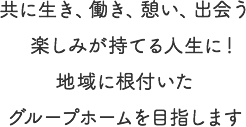 グループホームは地域の中の住宅に4~7人の小規模で家庭的な雰囲気の中で共同生活を行います。世話人により食事の提供、金銭出納に関する援助が行われ、生活支援員により健康管理、日常生活の相談・助言などが行われます。